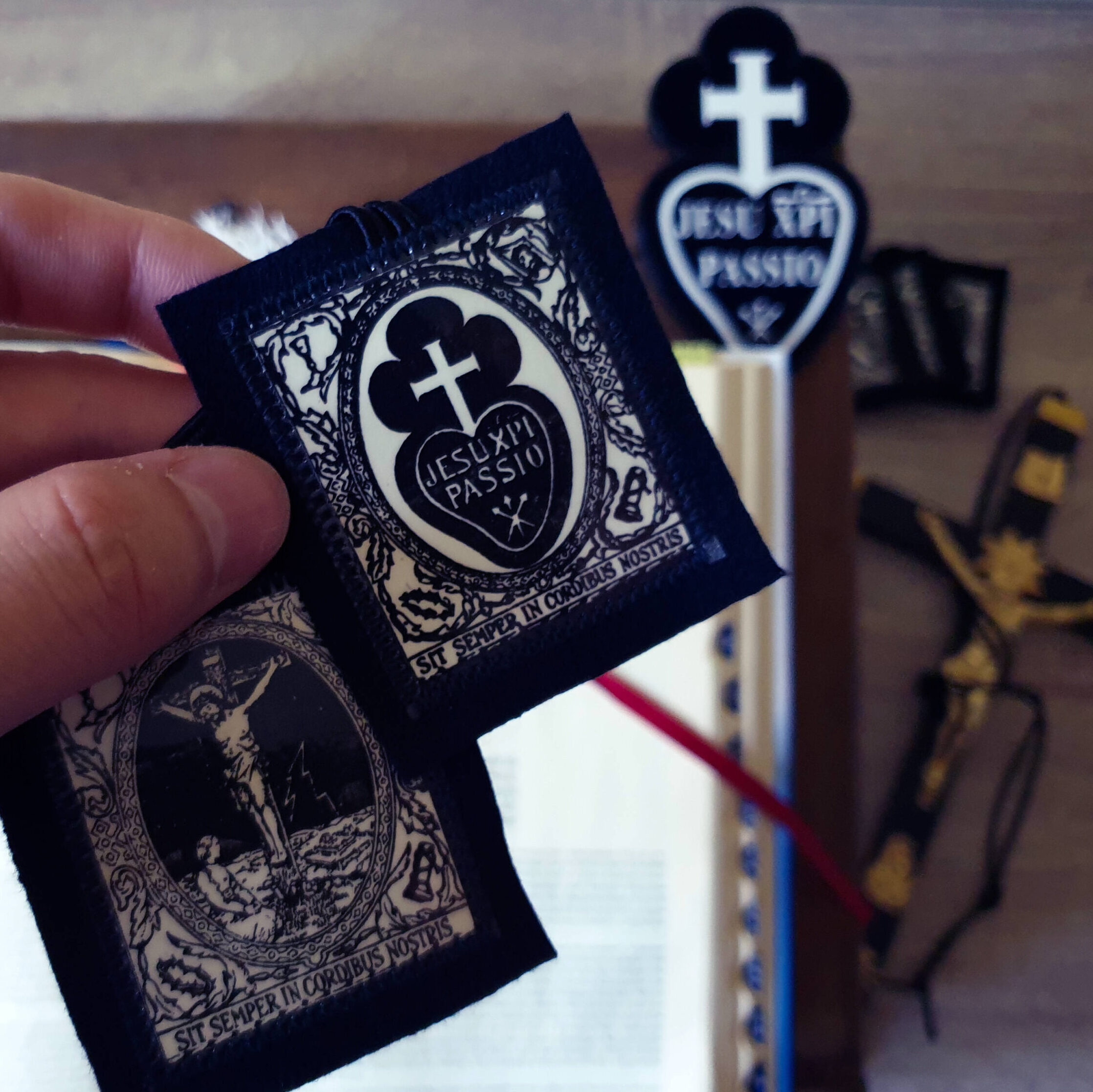 Прийняті до Братства отримували Чорний Скапулярій Страстей як зовнішній знак входження до Братства і користувалися духовними привілеями, присвоєними його носіям. Прохання про можливість накладання Чорного Скапулярію Страстей Господніх на членів братства було надіслано Пію IX у 1863 році Генеральним настоятелем отцем Петром Павлом Матері Божої Скорботної. Згромадження обрядів рескриптом від 30 липня цього року затвердило обряд благословення та покладення Чорного Скапулярію.